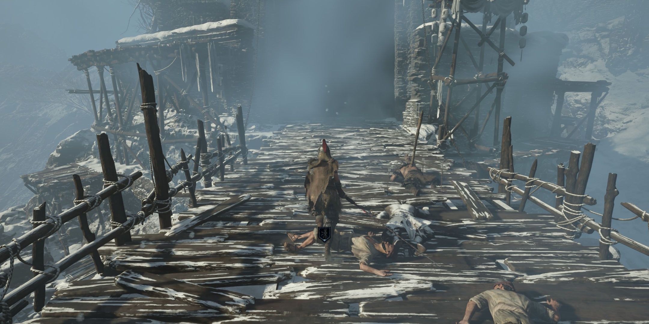 At this point, you’ll be familiar with the various spring-loaded mine traps buried in the snow as well as the dangers of Frostbite. You’ll face both of these as you trek up the hill and across the bridge to General Ming, so keep a close eye on where you run.