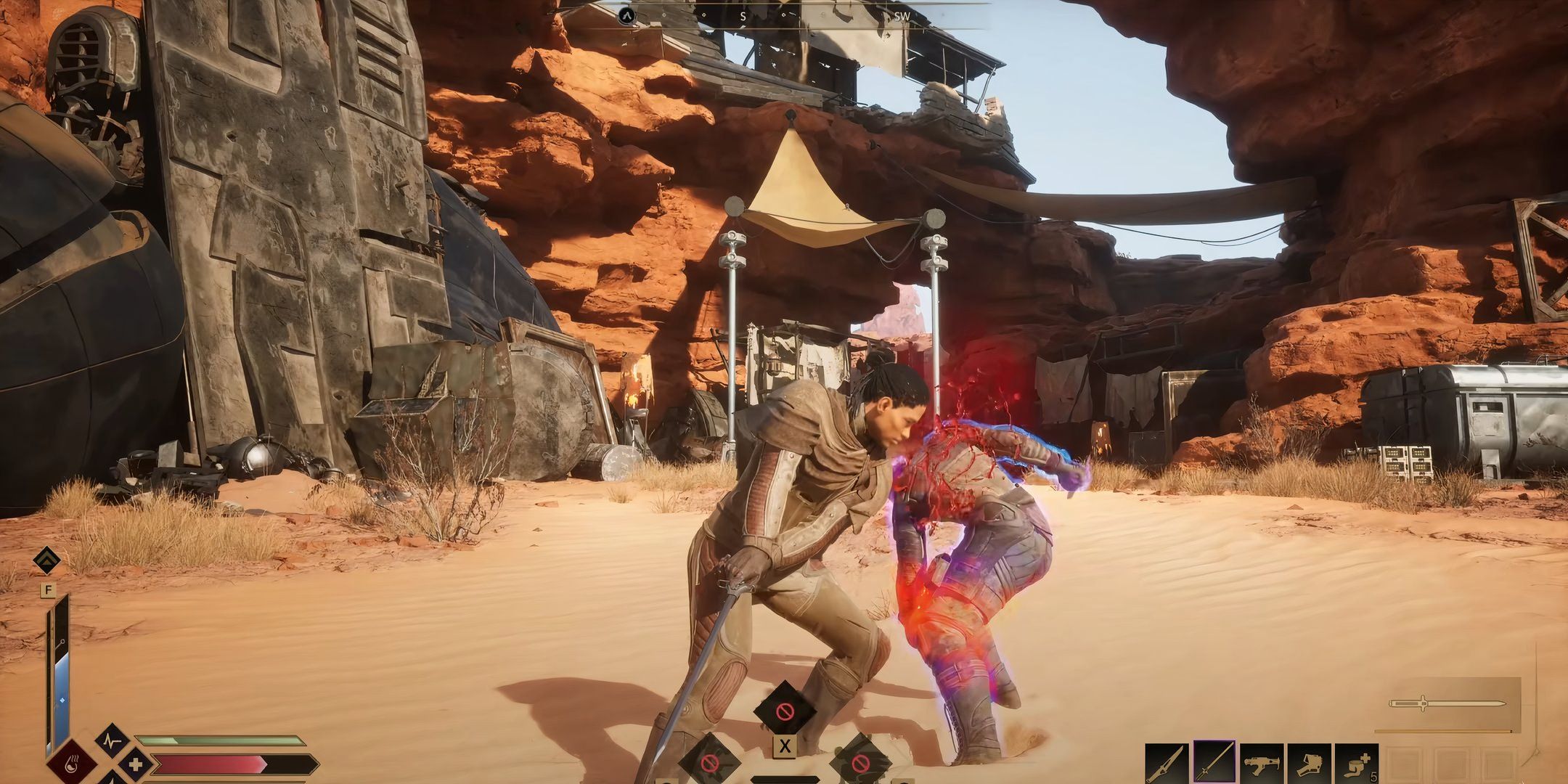 Where Dune: Awakening‘s combat shines is in its melee combat. Having to land a slow attack against an enemy to penetrate their shield feels both authentically Dune, and also unique. It creates a very different rhythm to melee combat, and forces you to be more precise than just mashing the attack button. The game’s auto-lock onto your opponents is also a nice feature, and the dash mechanic turns melee combat into an intricate and deadly dance with your opponent.